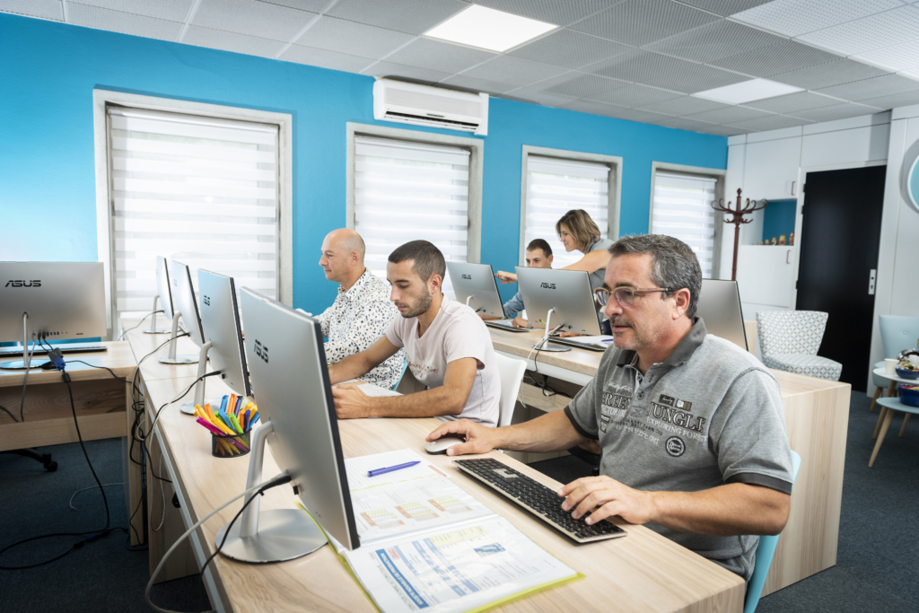 Accueil des stagiaires dans une salle dédiée à la formation, équipée d’ordinateurs récents et performants, d’un vidéo projecteur ou téléviseur, d’un tableau blanc.